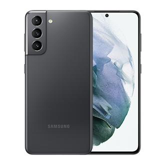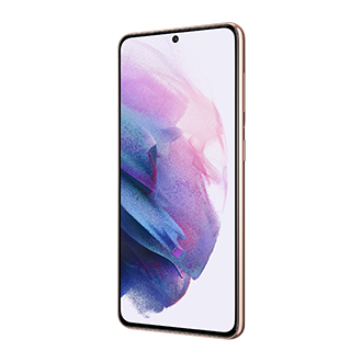 galaxy s21 5g phone in phantom violet seen from the rear in front of a galaxy s21 5g phone in phantom pink seen from the front the one seen from the front has a coral graphic wallpaper onscreen